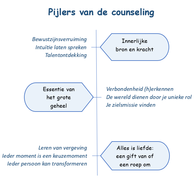 Jouw verhaal of ervaring staat centraal. En de vragen die bij je leven onderzoek je met hoofd, hart, ziel en geest. De laatste twee worden soms vergeten, terwijl ze je verder helpen in de vindtocht naar antwoorden. Bezig zijn met ziel en geest is een onderdeel van een spiritueel proces, de beweging naar wie jij ten diepste bent. Je bent met iedere levensvraag welkom: in je spirituele proces, over zingeving, rouw en verlies, je zielsmissie of bijzondere ervaringen (grenservaringen).